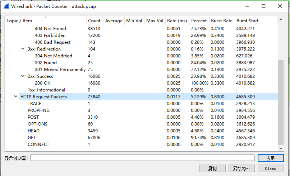 Wireshark里点击“统计”-“HTTP”-“分组计数器”,统计结果为52.39%。