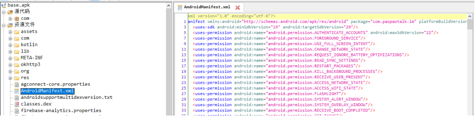 将提取出来的APP安装包拖进jadx-gui中,通过查看AndroidManifest.xml中的package对应的值获取包名。