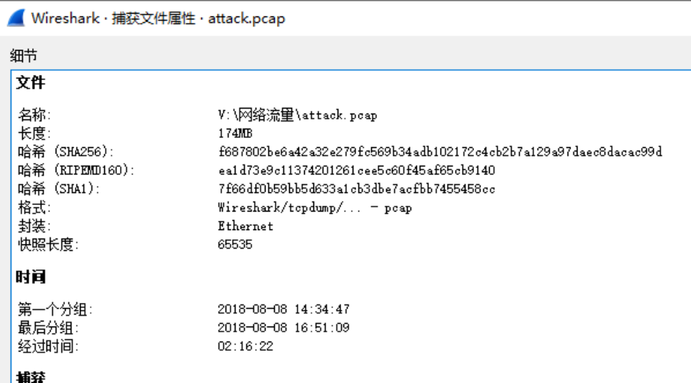 用wireshark打开流量包,“统计”-“捕获文件属性”。