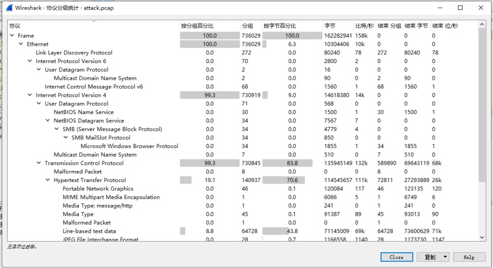 确定流量较大的IP后,我们需要进一步推测这些IP是基于什么协议发起的。点击“统计”-“协议分级”,从协议的高低层次进行排查,发现HTTP层协议较多。