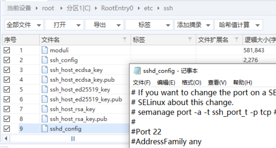 通过查看/etc/ssh/sshd_config,发现端口字段被注释了。不太确定端口号,直接开仿真系统来查看。