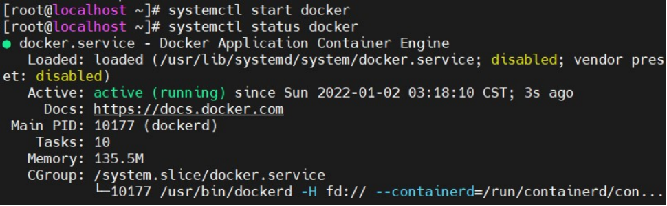 先看一下docker状态。执行命令“systemctl status docker”,发现状态为未开启,接着执行命令“systemctl start docker”启动docker。![]()