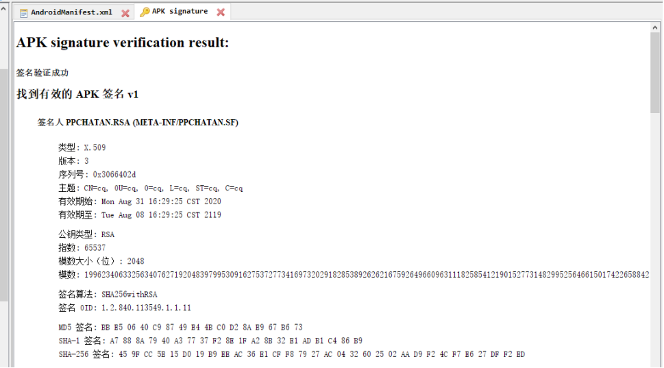 APP签名可以通过jadx_gui中的“APK signature”模块查看,除了应付比赛以外,这里往往也是案件侦破中的意外之处。