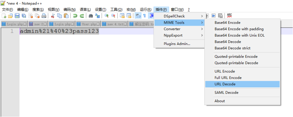 提取密码并进行url解码。在Notepad++选中该密码,“插件”-“MIME Tools”-“URL Decode”将url解码,得到admin的登录密码:[email protected]#pass123。![]()
