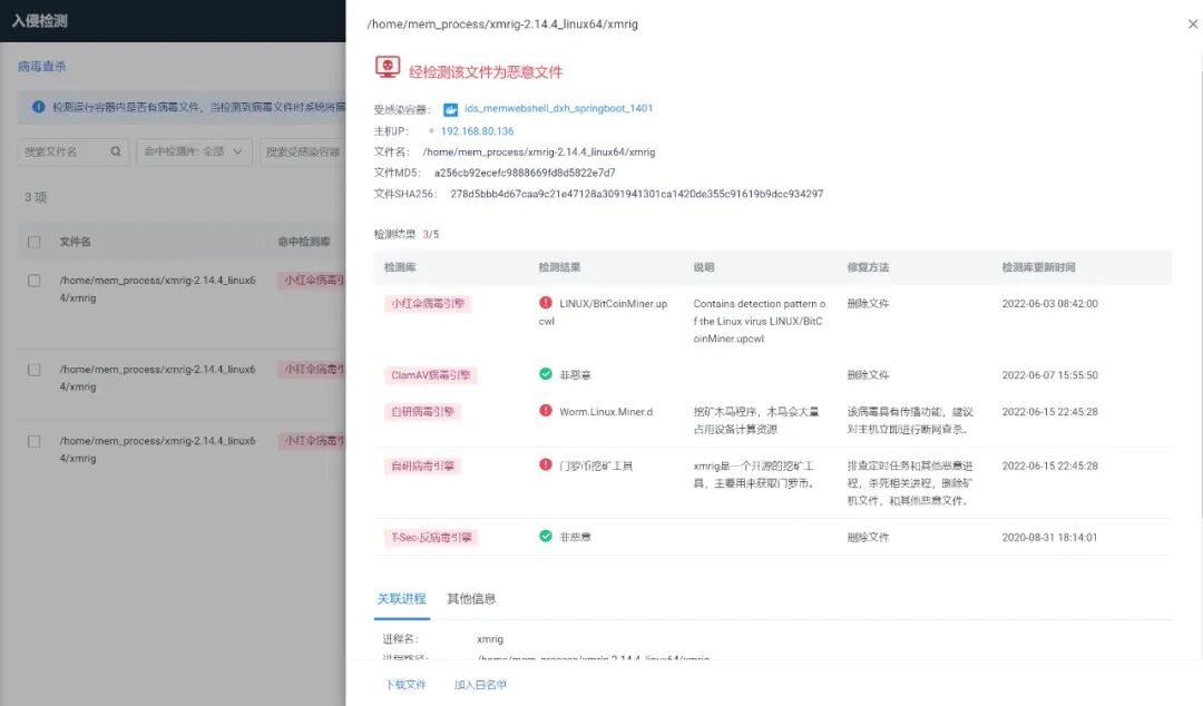 首先,可检测容器内无文件攻击,支持发现内存webshell、shellcode和加载动态链接库等多种内存码。