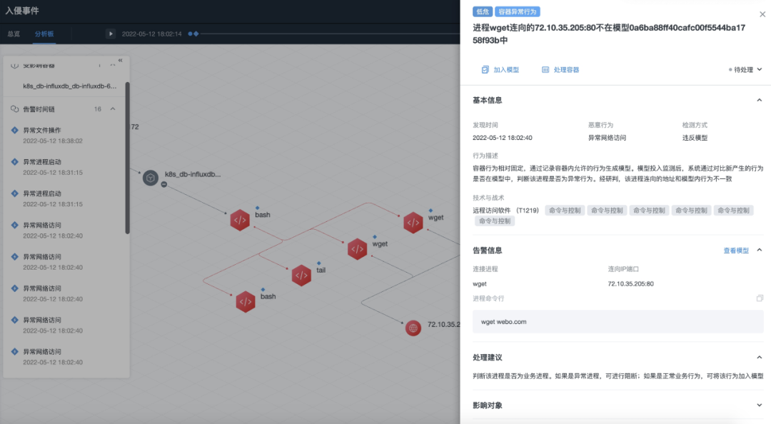 青藤蜂巢,可对容器内进程、网络等行为进行学习建立模型,从而发现异常入侵。针对重要的容器靶机、集群系统进行提前学习,形成稳定的模型,一旦发现异常进程启动、异常端口监听、异常网络连接和异常文件操作就立即报警。