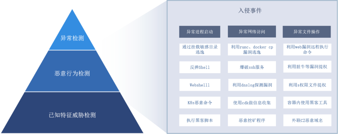 其次,可检测容器逃逸行为,支持发现K8S组件漏洞逃逸、内核漏洞逃逸、容器漏洞逃逸、敏感挂载逃逸等行为。