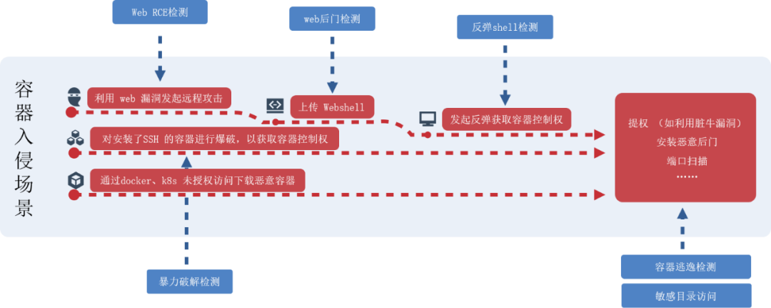 在容器时代,安全面临新旧威胁的双重挑战。一方面,那些传统旧的攻击手段依然有效,包括漏洞利用、暴力破解、权限提升等等。另一方面,新的攻击姿势也是层出不穷,例如投毒镜像、容器逃逸、集群API调用等等,让人防不胜防。