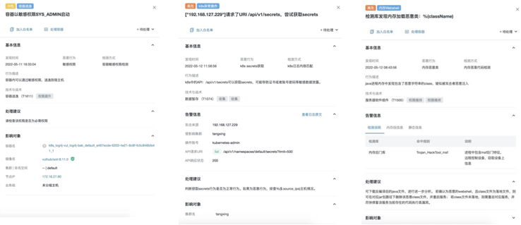 最后,可检测K8S API恶意行为,支持包括匿名用户登陆、secrets获取、API server可疑操作等。