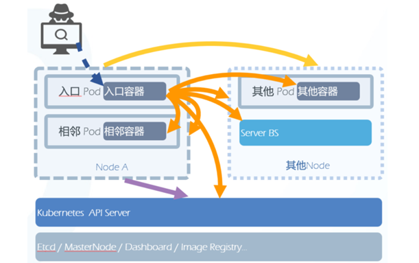 在容器集群中,只要攻陷一个容器,就可以横向移动到其它容器上,或者逃逸到node节点上进行持久化,控制整个节点。下一步,攻击者还可以通过漏洞利用或者调用API SERVER控制整个集群。而集群作为集权类系统,一旦失陷,防守方“血条”减少一大截就不可避免了。