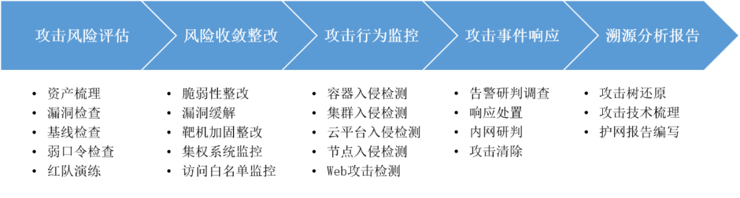 该方案覆盖了几个核心环节,包括攻击风险评估、风险收敛整改、攻击行为监控、攻击事件响应、溯源分析报告共五个环节,可实现容器全生命周期的主动防御效果。