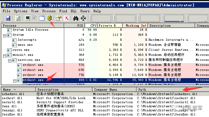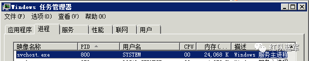 打开任务管理器,发现 pid 800 是 svchost.exe 程序,由于该程序的特性,需使⽤第三⽅⼯具 pe 进⾏检查。
