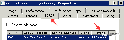 在 pe 中双击该程序,点击【tcp/ip】,可发现 49154 端⼝是服务 schedule 监听。