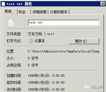 1 在 %temp% ⽬录下创建并修改 test.txt ⽂件的创建时间为 1999 年 01 ⽉ 01 ⽇ 00 点 00分 00 秒,修改时间为 1999 年 01 ⽉ 02 ⽇ 00 点 00 分 00 秒、访问时间为 1999 年 01 ⽉03 ⽇ 00 点 00 分 00 秒;