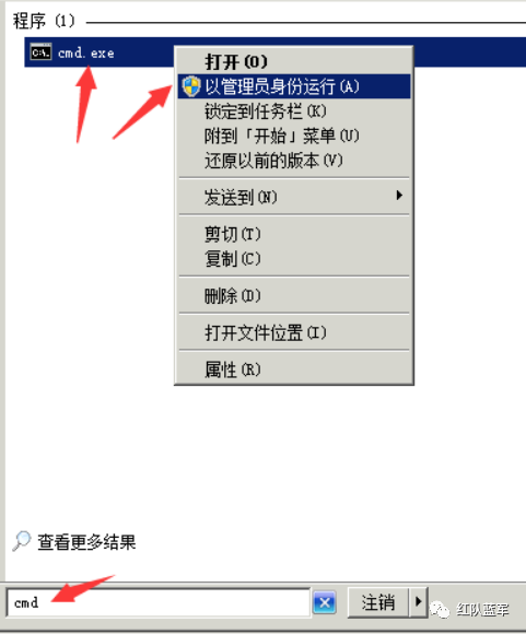 点击【开始菜单】,搜索框中输⼊【cmd】,右键点击【cmd.exe】程序,选择【以管理员身份运⾏】。