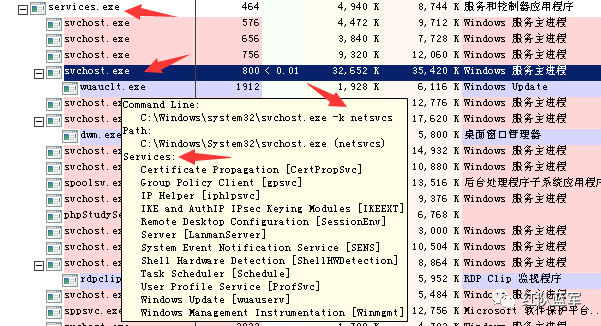 通过 pe ⼯具可发现 pid 800 是由服务启动,根据启动路径可发现该程序是由正常路径启动,但程序是否被替换未知,启动的服务是 netsvcs,该服务下挂 12 个⼦服务。