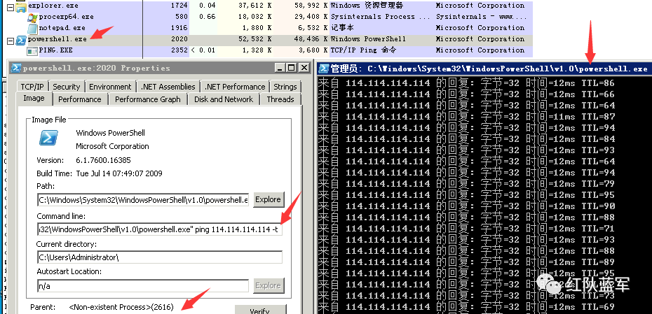 start powershell -NoP -NonI -W Hidden "ping 114.114.114.114 -t"