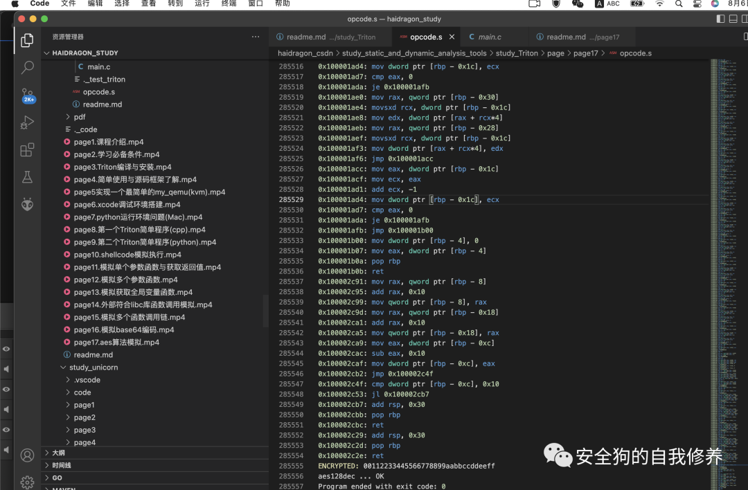 # Triton视频教程## Triton介绍与环境搭建* 1.课程介绍* 2.学习必备条件* 3.Triton编译与安装* 4.简单使用与源码框架了解* 5.实现一个最简单的my_qemu(kvm)* 6.xcode调试环境搭建* 7.python运行环境问题(Mac)* 8.第一个Triton简单程序(cpp)* 9.第二个Triton简单程序(python)* 10.shellcode模拟执行## 模拟x86_64架构* 11.模拟单个参数函数与获取返回值* 12.模拟多个参数函数* 13.模拟获取全局变量函数* 14.外部符合libc库函数调用模拟* 15.模拟多个函数调用链### 模拟常用算法(x86_64)* 16.模拟base64编码* 17.aes算法模拟* 18.des算法模拟* 19.rc4算法模拟* 20.其它算法模拟思路### 跟unicorn对比* 21.模拟执行比对* 22.设计构架比对* 23.hook指令* 24.libc函数hook* 25.事件回调* 26.高级话题## arm64架构模拟* 27.模拟单个参数函数与获取返回值* 28.模拟多个参数函数* 29.模拟获取全局变量函数* 30.arm构架中的算法模拟* 31.android中模拟与JNI交互* 32.JNI模拟call java函数## 高级部分* 30.可执行文件模拟* 31.符号执行与污点分析* 32.符号执行案例* 33.污点分析案例* 34.* 35.* 36.