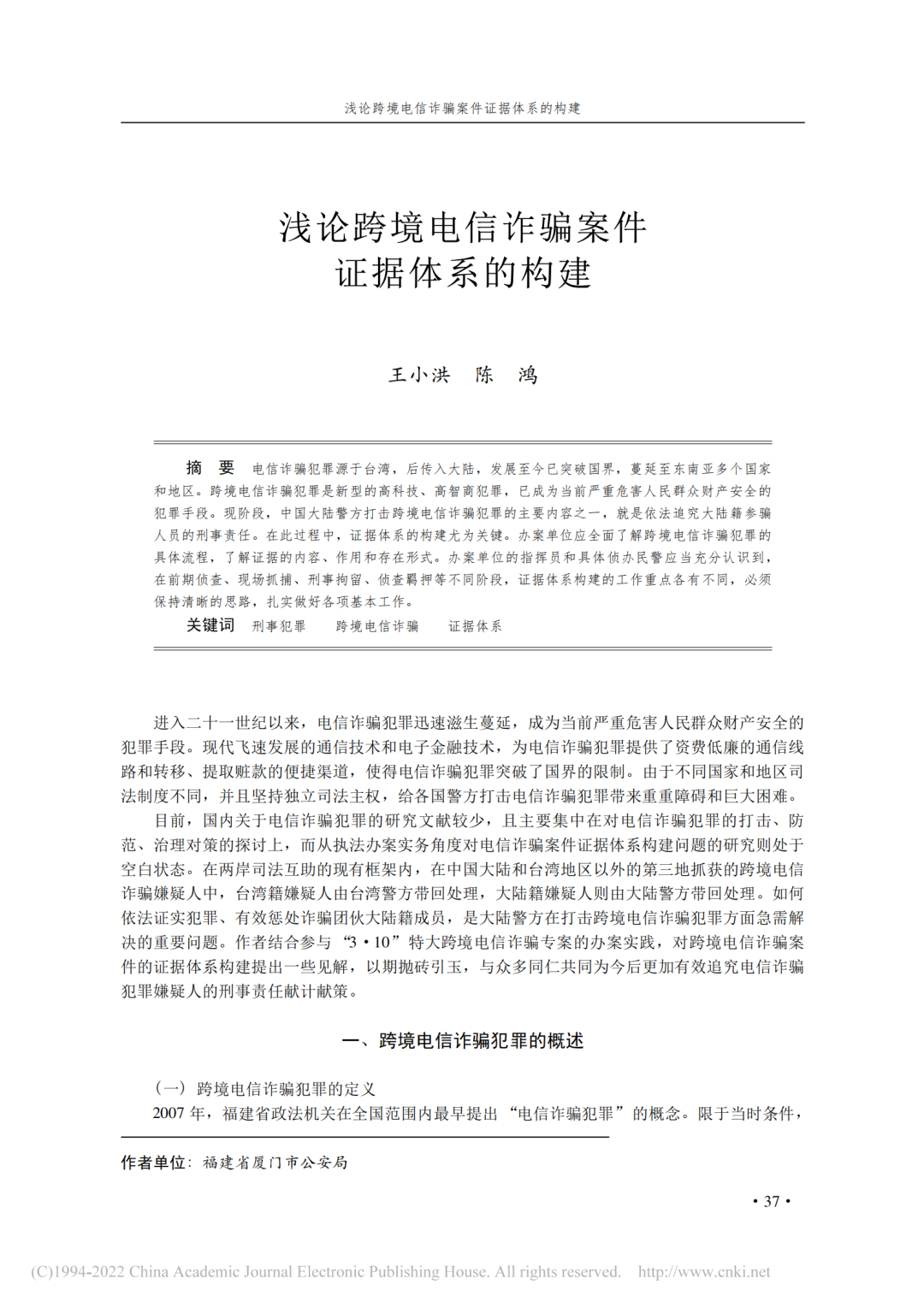 王小洪,陈鸿.浅论跨境电信诈骗案件证据体系的构建[J].公安研究,2012(12):37-44.