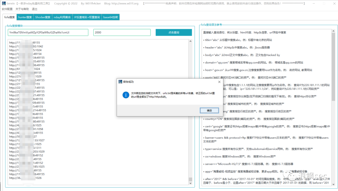 python3 Serein.py点击左上角的软件配置配置fofa的email和key(注意不是密码,而是https://fofa.info/personalData下方的API KEY),然后就可以愉快地使用fofa搜索啦。注意:必须是fofa普通/高级/企业账号,因为fofa注册会员调用api需要消耗f币,如果您是注册会员请确保您有f币,否则无法查询!