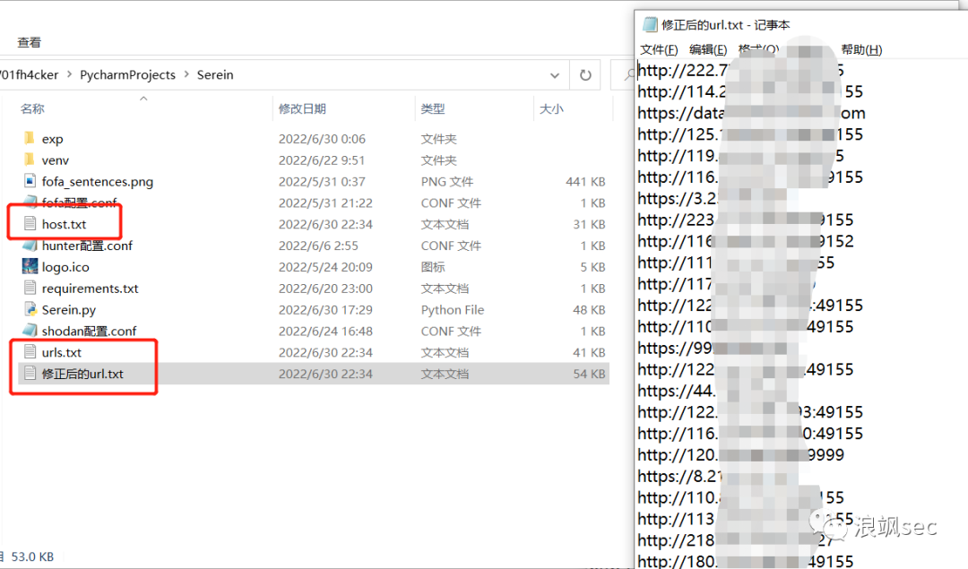 搜集完成之后,软件的同级目录下会生成urls.txt、修正后的url.txt、host.txt,分别保存采集的原始url、添加了http/https头的url、仅网站IP。