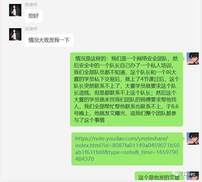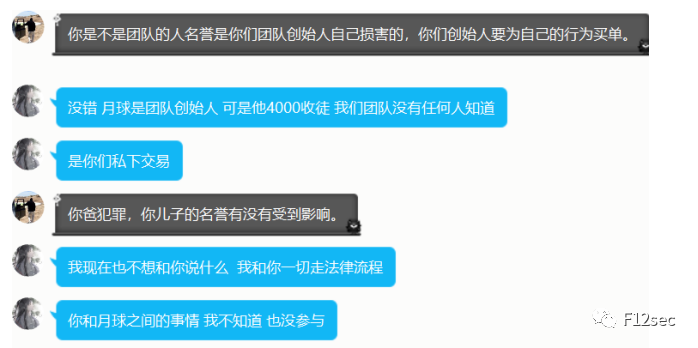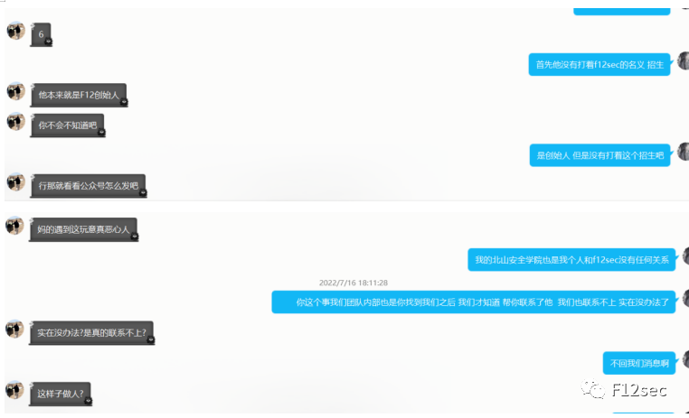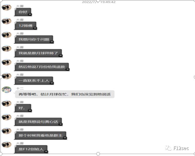 F12sec全体成员都不知道这个事情,于2022年七月十六日再次找到团队成员,钟北山此时也已经和他说说明:F12sec团队没有参与大雾和月球的交易,并说明了这个是个人培训与团队无关: