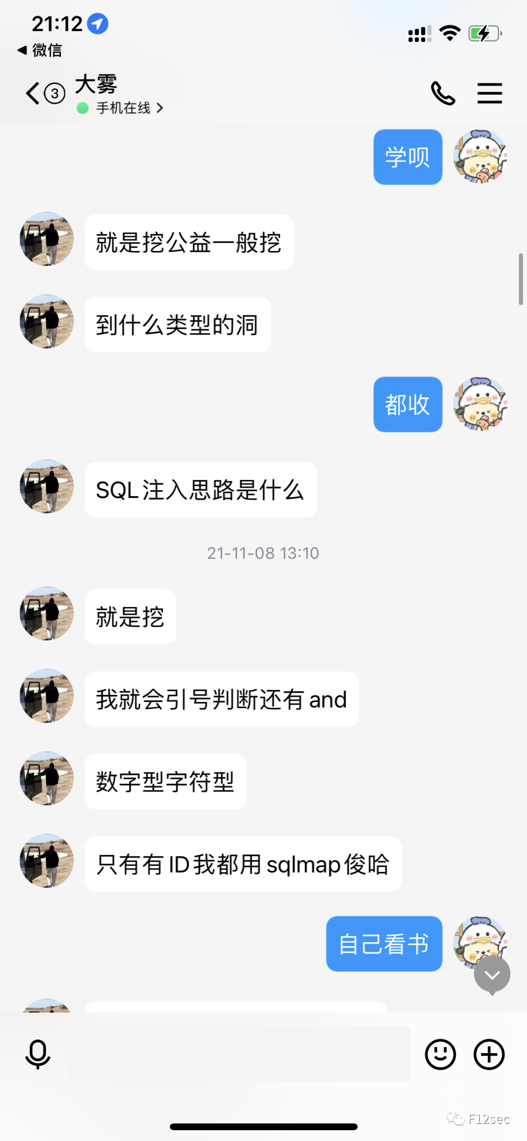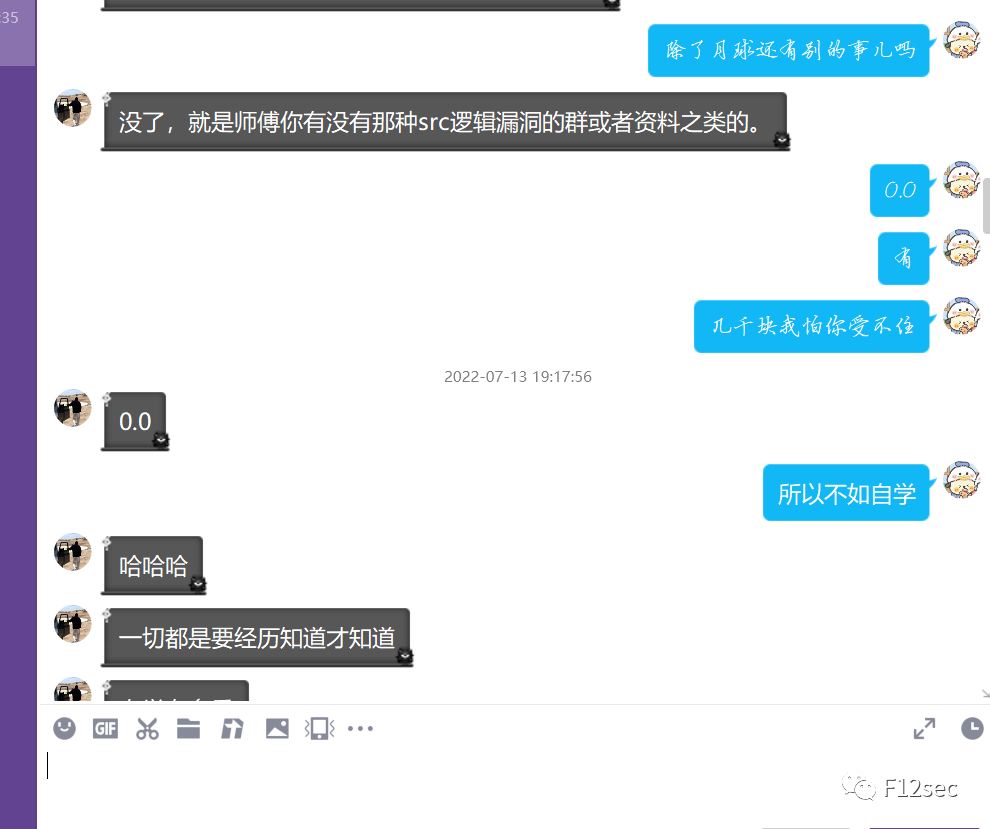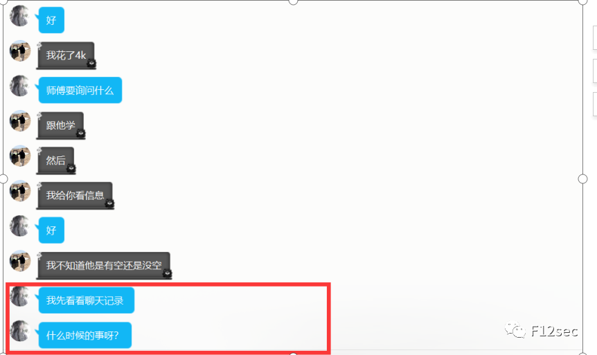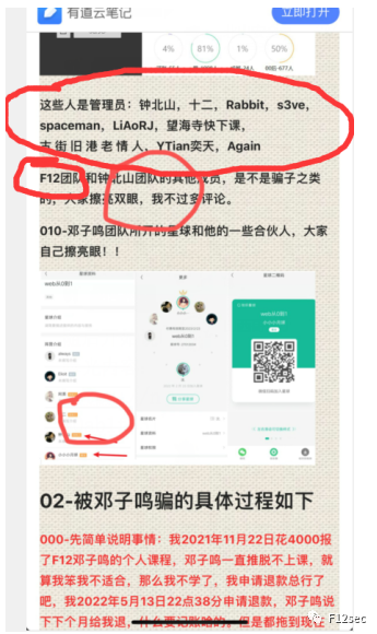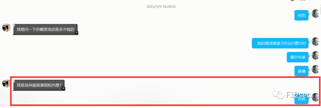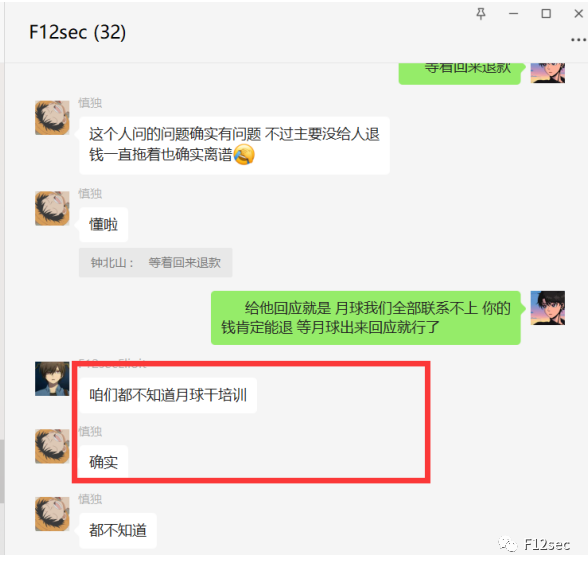 成员钟北山以为大雾是找自己培训便回答了,后续聊天才得知,大雾与团队创始人月球有私下交易收徒,f12sec全体成员都不知道这个事情,团队没有收取他一分钱: