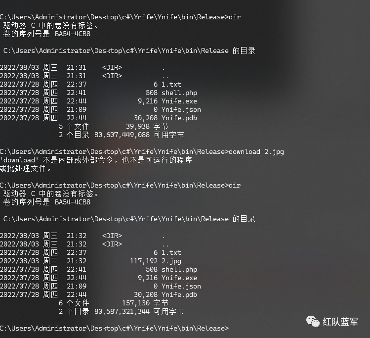 while循环当string cmd = Console.ReadLine(); cmd值为break或者quit或者exit退出循环。cmd值为help或者h或者?,使用教程。upload和download分别调用uploadFile类upload方法和download类downloadFile方法。这里先不管,先看命令执行。看到webshell。