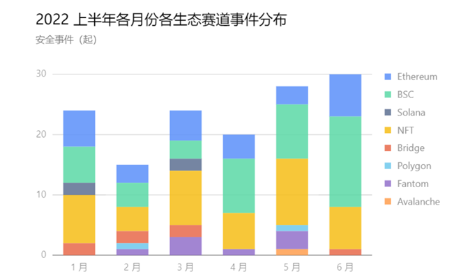 尽管 2022 年区块链技术正在飞速发展并且逐渐完善,但层出不穷的加密货币攻击事件对区块链生态安全态势提出了新的挑战。从统计数据来看,上半年发生安全事件次数较多的月份主要在 5、6 月;从各生态来看,BSC 上安全事件发生最多;从赛道来看,损失最多的是跨链桥。