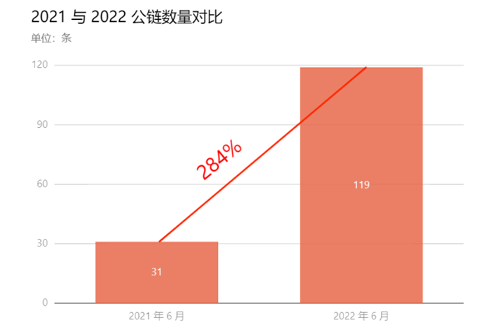 作为区块链行业的基础设施,公链承载了人们对于区块链作为 Web3 底层网络的期望。随着一代又一代公链的崛起,NFT、DeFi、GameFi、元宇宙等生态热潮也相继迎来爆发,同时这些项目也促进了公链的发展与价值提升,使多链世界从理想走向了现实。据 Footprint Analytics 的数据,截至 6 月累计已收录的公链数量有 119 条,对比 2021 年 6 月收录的 31 条,同比增长约 284%。