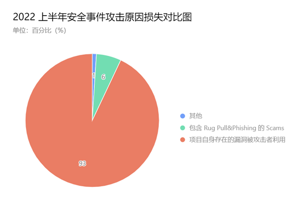 在这些安全事件中,约 77% (144 起)源于项目自身存在漏洞被攻击者利用,损失金额约 18.4 亿美元,占安全事件总损失的 93%;约 21%(39 起) 源于包含 Phishing&Rug Pull 的 Scams,损失金额约 1.3 亿美元,占安全事件总损失的 6%。