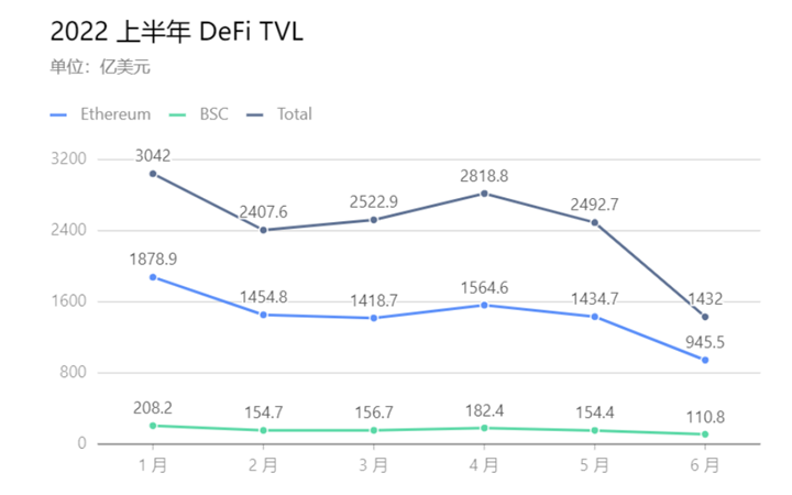 DeFi 作为世界上最受欢迎的可编程区块链,2022 发展态势不可小觑,据 DeFi Llama 数据显示,6 月 30 日 DeFi 总锁仓价值为 1432 亿美元,其中 ETH 链以 945.5 亿美元的 TVL(Total Value Locked)占据了资金沉淀的半壁江山,其次是 BSC 链的 110.8 亿美元。2021 年以来,许多新兴公链如 Solana、Avalanche 等通过拥抱 DeFi 快速发展链上生态,也吸引了大量用户和资金沉淀。6 月 30 日 Solana TVL 为 26.4 亿美元,同比增长 77%;Avalanche TVL 为 55.4 亿美元,同比增长 96%。