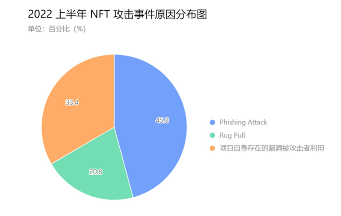 蓬勃发展的同时意味着赛道发生的安全事故也不在少数,根据 SlowMist Hacked 不完全统计,截至 6 月 30 日 NFT 赛道安全事件约 48 起,损失超 6281 万 美元。其中 33.4%(16 起)源于项目自身存在的漏洞被攻击者利用,20.8%(10 起)源于 Rug Pull, 而钓鱼攻击占了大部分,占比为 45.8%(22 起),多数都是由于 Discord/Twitter 等媒体平台被黑后黑客发布钓鱼链接。
