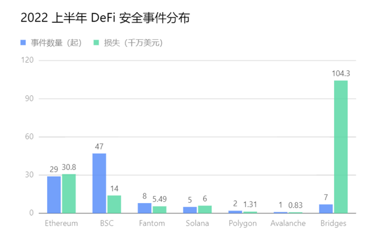 随着 DeFi 热潮的兴起,该领域也自然成为了黑客觊觎的重点对象。根据 SlowMist Hacked 统计,截至 6 月 30 日 DeFi 安全事件约 100 起,损失超 16.3 亿美元。其中在 BSC、ETH、Fantom、Solana、Polygon、Avalanche、跨链桥上发生的安全事件数量分别为 47 起、29 起、8 起、5 起、2 起、1 起、7 起,所造成损失分别为 1.4 亿美元、3.08 亿美元、5491 万美 元、6383 万美元、1310 万美元、830 万美元、10.43 亿美元。