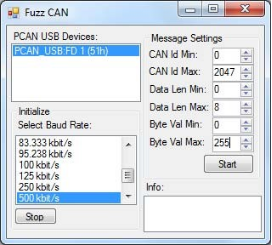 用于模糊测试的软件是用C#计算机编程语言编写的。使用的集成开发环境(IDE)是Microsoft Visual Studio。软件模糊测试程序的主要功能项目是用于命令和控制的用户界面(UI)屏幕、常规CAN数据传输的定时线程、模糊CAN消息的随机字节发生器、通信API处理模块和CAN总线流量监视器。