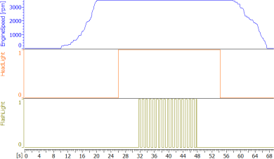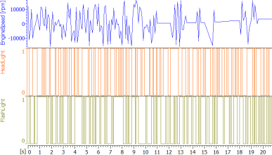 来自模糊器的随机CAN数据包的影响可以在矢量模拟器中进行测量。正常的车辆信号如图6所示。图7,在比图6更短的时间内被捕获,说明了随机数据包对信号的影响。
