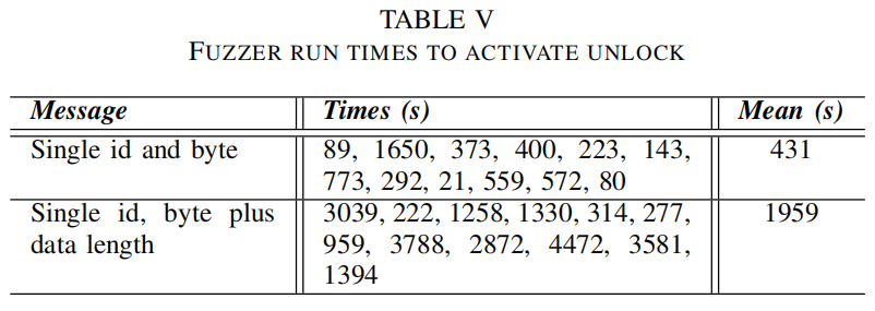 关于在车辆CAN总线上应用模糊测试。实验结果证实了之前关于车辆模糊测试的声明,即: