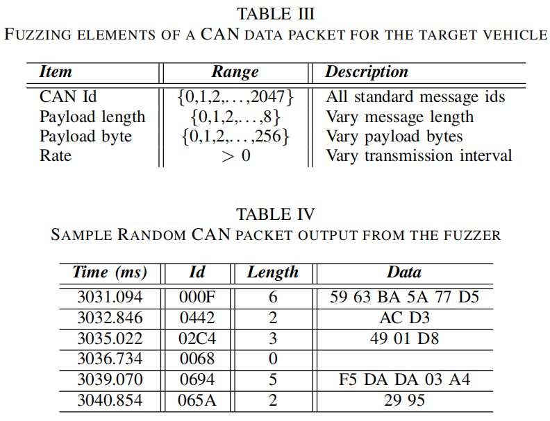 目标车辆使用标准的CAN数据包(11位ID)。可供模糊处理的数据包参数(ID、数据长度、有效载荷字节)见表三。根据模糊器中定义的参数,生成随机的CAN数据包见表四。
