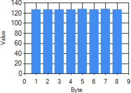 该模糊器分析了CAN数据,以便进行数据完整性检查。图4显示了每个字节位置的平均数据字节值,是从目标车辆的网络中捕获的100,000个CAN数据包计算出来的。它显示了一个非线性分布的八位数值。相比之下,图5显示了对由模糊器生成的66144个CAN数据包的相同计算结果。该线性分布,即所有消息中所有字节的总体平均值为127,这证明了模糊器正确地生成了字节值的均匀分布。