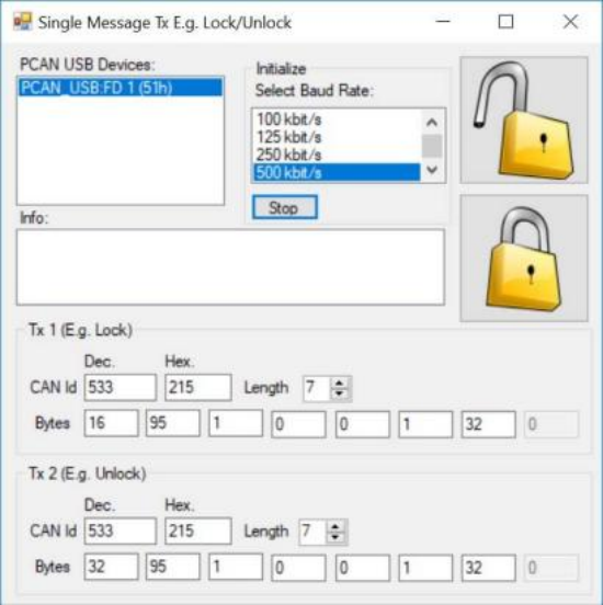 在这个实验中,一个PC应用作为智能手机应用,图13,作为信息娱乐系统ECU的代理发送锁定和解锁命令。这导致LED灯的开启和关闭,表明在锁定和解锁车门方面的正常系统操作。用模糊器,见图3,在随机产生的CAN数据几分钟后,解锁(或锁定)功能被激活。为了帮助检测解锁状态,测试平台被增强以传送解锁确认的CAN消息。对于真正的车辆还需要另一种检测机制,例如门锁上的传感器。