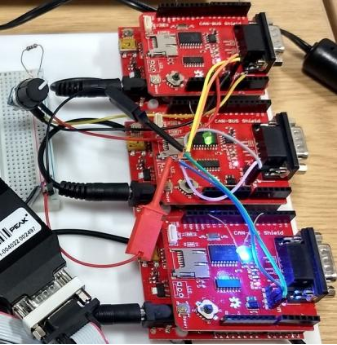 一个CAN总线目标是由带有CAN接口的Arduino单板计算机(SBC)构建的。每个SBC在网络上充当一个ECU。CAN总线上的信息是在目标车辆的CAN总线上传输的信息的一个小子集。其中一个ECU作为车身控制模块(BCM),其发光二极管(LED)代表车辆的锁定状态(off代表锁定,on代表解锁),见图11。