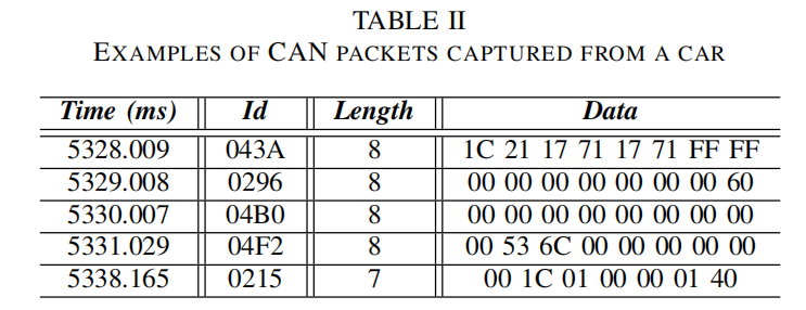 CAN总线是在20世纪80年代引入的,对于那些对比特级协议感兴趣的人来说,[23]有大量的可用的资源。总线上的每个节点(ECU)都可以启动数据传输,一次只传输一个节点。对于一个标准的CAN数据帧来说,11位的仲裁标识符(又称数据包标识符)允许最高优先级的信息在两到多个节点同时传输的情况下继续传输。一个标准的CAN数据包有多达八个字节(64位)的数据。节点中的CAN收发器芯片自动处理协议,向高层应用提供id、数据长度和数据字节。表二显示了从目标车辆上捕获的一些CAN数据包。按照今天的标准,标准CAN的传输速度并不高,被设计为支持高达1Mb/s。汽车中常用的传输速度是500kb/s。