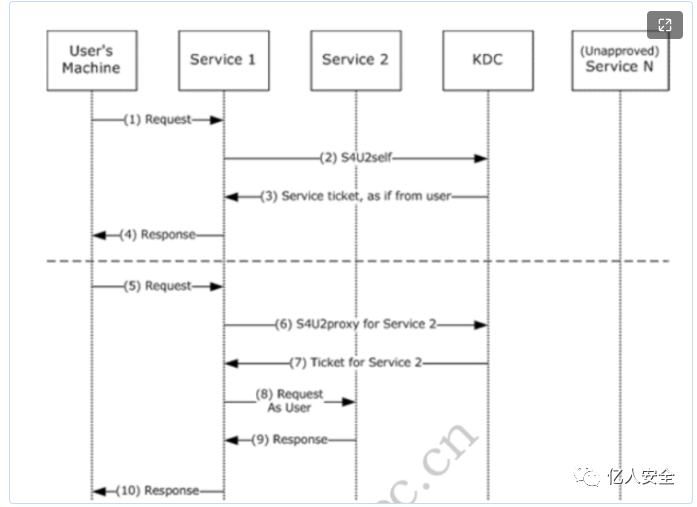 允许受约束委派的服务代表任意用户向KDC请求服务自身,从而获得一张该用户(任意用户)的对当前受约束委派服务的票据TGS(ST),该服务票据TGS(ST)包含了用户的相关信息,比如该用户的组信息等。