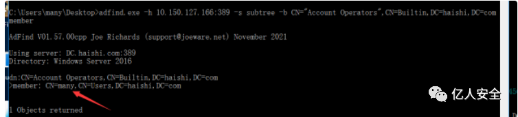 adfind.exe -h 10.150.127.166:389 -s subtree -b CN="Account Operators",CN=Builtin,DC=haishi,DC=com member