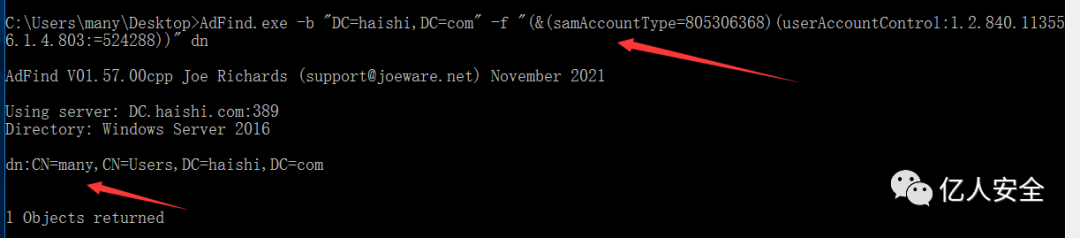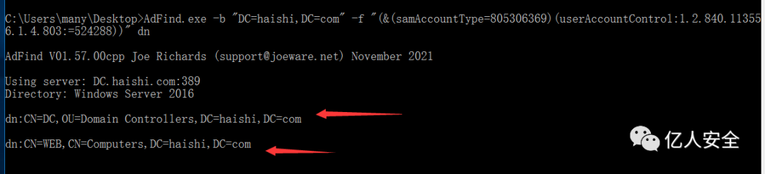 AdFind.exe -b "DC=haishi,DC=com" -f "(&(samAccountType=805306369)(userAccountControl:1.2.840.113556.1.4.803:=524288))" dn域内域控机器账户默认设置了非约束委派